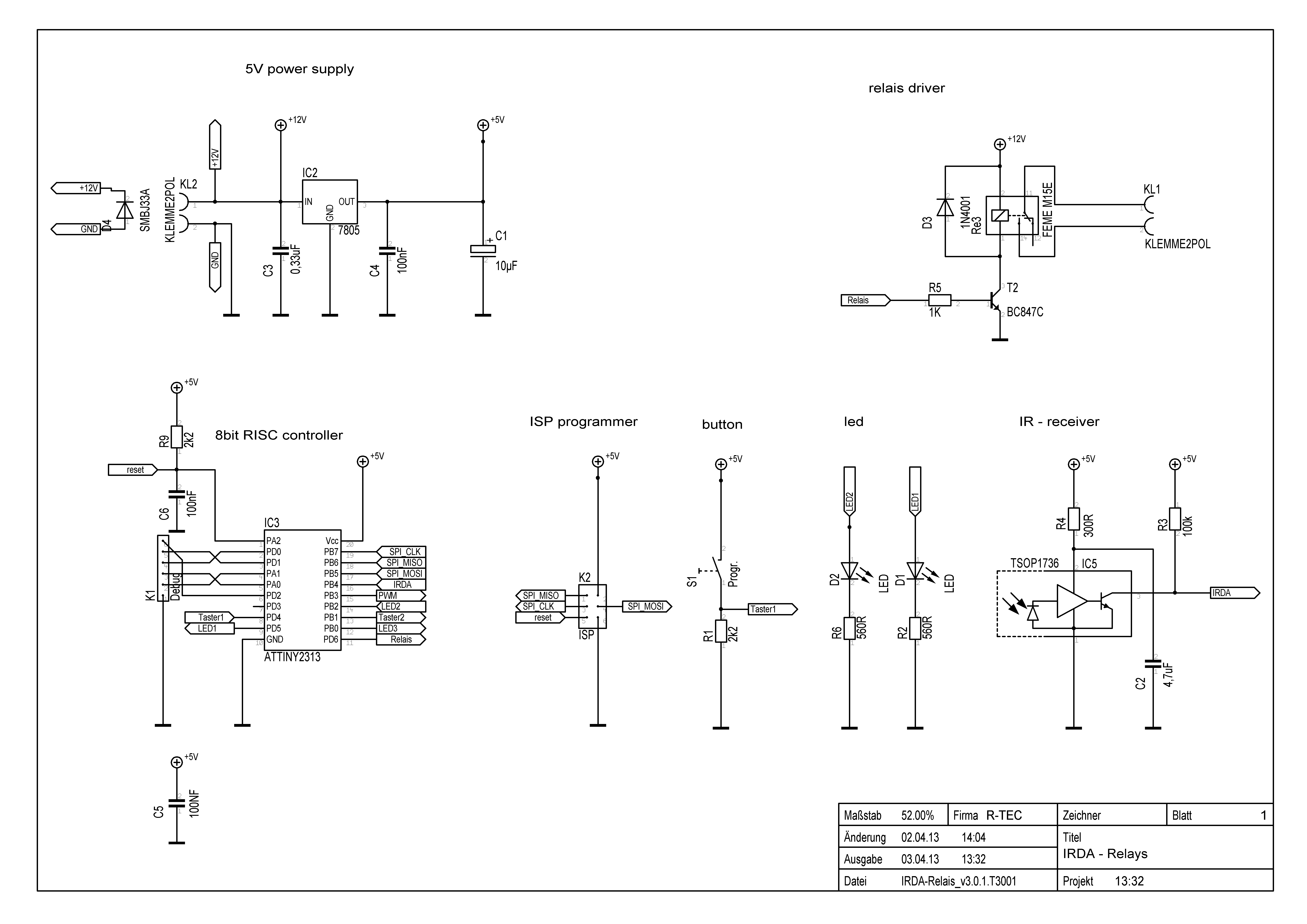 Mein Projekt "IRDA" ist ein IR Empfänger bei dem alle möglichen RC5-codierten Fernbedienungen mittels "Teach-In" eingelernt werden können.